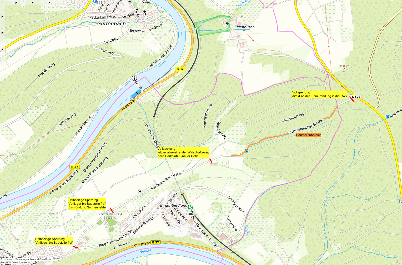 Im Zeitraum vom 10. bis 23. Februar 2025 wird die Ortsverbindung Binau-Reichenbuch aufgrund von Baum- und Waldarbeiten gesperrt. Die Vollsperrung betrifft die Reichenbucher Straße.