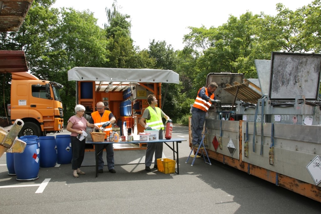 Schadstoffhaltige Abfälle müssen in dicht schließenden Gefäßen, möglichst den Originalgefäßen, gebracht werden. Es kann vor Ort nichts umgefüllt werden. Das maximale Volumen beträgt 30 Liter.Angenommen werden insbesondere: Akkus und Batterien, flüssige Farben, Lacke, Desinfektions- und Holzschutzmittel und ähnliche Stoffe. Energiesparlampen und Leuchtstoffröhren, ölverschmutzte Abfälle, Pflanzenschutz- und Schädlingsbekämpfungsmittel aus dem Hausgarten, quecksilberhaltige Fieberthermometer, Reinigungsmittel, Säuren; Spraydosen mit Restinhalt, Verdünner sowie Chemikalienreste. Bauschaum-Dosen werden leer oder befüllt angenommen.