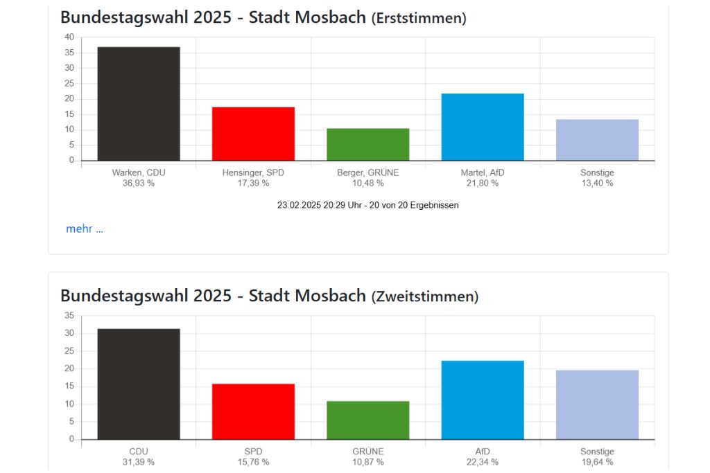 Von 16.470 Wahlberechtigten haben 12.857 Mosbacherinnen und Mosbacher ihr Wahlrecht wahrgenommen. Das sind 78,06 % Wahlbeteiligung.