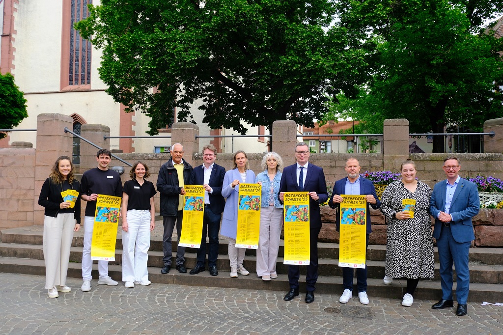 Der Mosbacher Oberbürgermeister Julian Stipp (rechts) zusammen mit Organisatoren und Sponsoren des Mosbacher Sommer 2025. ©Stadt Mosbach