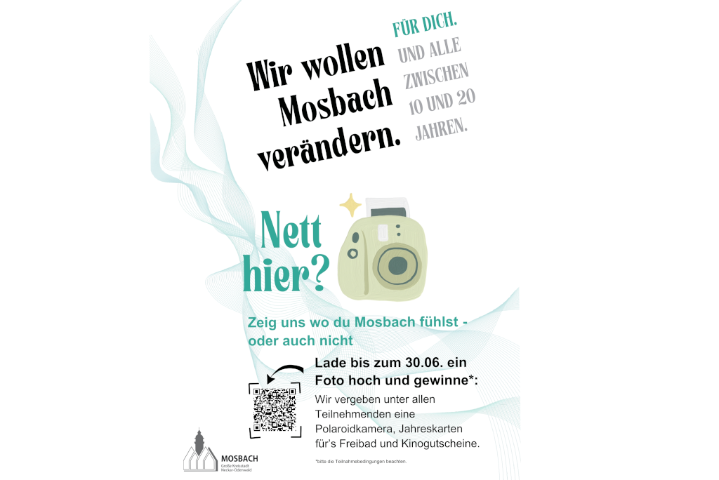 Ab sofort und einschließlich bis zum 30. Juni können Jugendliche ihre Beiträge online unter www.mosbach.de/netthier einreichen. An den Mosbacher Schulen hängen entsprechende Plakate mit QR-Codes aus. Am Ende der Einsendungsphase startet ein Voting durch eine Jury bestehend aus Jugendlichen des ehemaligen Jugendgemeinderats: Die Bilder mit den meisten Stimmen werden im Spätsommer öffentlich ausgestellt und mit Preisen bedacht – es locken unter anderem eine Polaroidkamera und kostenlose Jahrestickets für das Mosbacher Freibad famos.