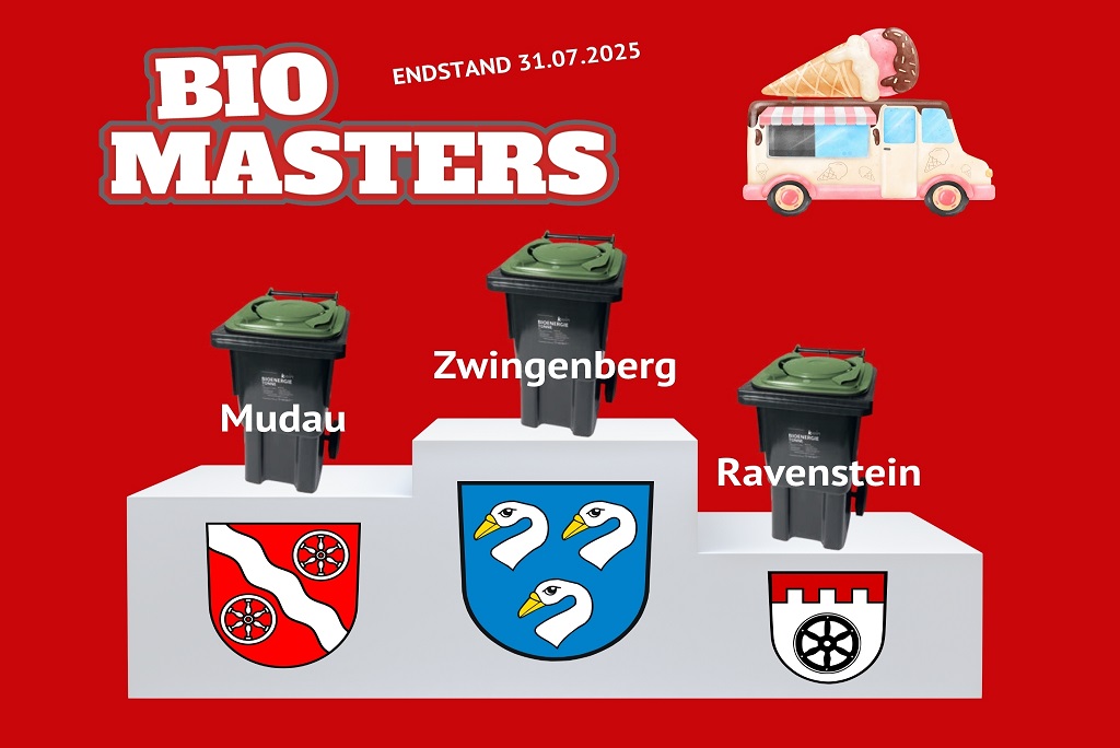 Was für ein Finale! Nach drei Monaten Bioabfalltrenn- und Sammelfieber stehen endlich die Sieger der ersten von der Kreislaufwirtschaft Neckar-Odenwald (KWiN) ins Leben gerufenen BioMasters Kampagne fest.Das Ziel der 27 Gemeinden im Neckar-Odenwald-Kreis dabei: möglichst wenige Fehlwürfe und damit möglichst wenig stehen gebliebene BioEnergieTonnen in der eigenen Gemeinde zu haben. Am Ende hat sich Zwingenberg in buchstäblich letzter Sekunde, mit einer unglaublichen Quote von 0,56% an stehengebliebenen Biotonnen, Platz 1 gesichert. Auf den starken Plätzen zwei und drei folgen Mudau und Ravenstein, die mit Quoten von 0,74% und 0,90% ebenfalls beeindruckend niedrige Fehlwurfquoten aufweisen und sich mit ihrer Platzierung unter den Top 3 neben Zwingenberg einen der drei begehrten Eiswagen sichern konnten.