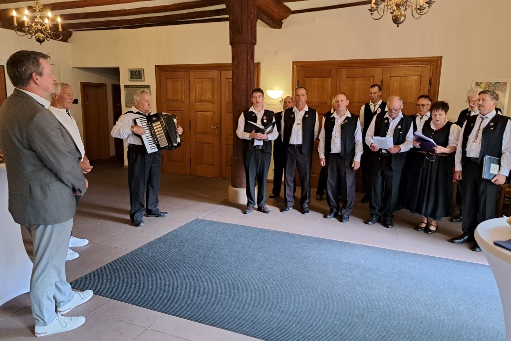 40 Jahre bereits sorgt auch die Gesangsgruppe der Mosbacher Donauschwaben für Geselligkeit und Freude - sei es bei Auftritten Zuhause oder bei Treffen im Ausland. Zum Jubiläum durfte man sich über Besuch des befreundeten Männersingkreises aus dem ungarischen Soroksár freuen. Zu deren Aufenthalt zählte nicht nur ein musikalischer Abend im Donauschwabenhaus, ein Auftritt bei den Heimattagen Baden-Württemberg in Weinheim und Ausflüge u.a. ins Technikmuseum Sinsheim, sondern selbstverständlich auch im Mosbacher Rathaus.